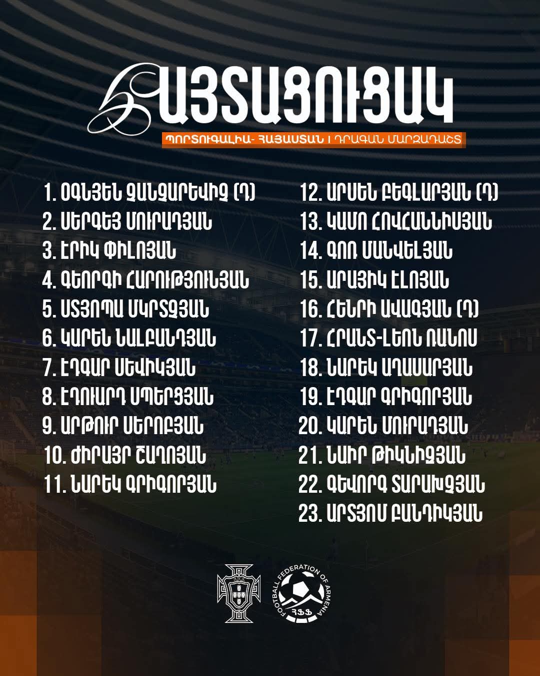 The Armenian national team's roster for the 2026 World Cup European Zone qualifying round match against Portugal has been announced. The match kicks off at 6:00 PM Yerevan time."/>