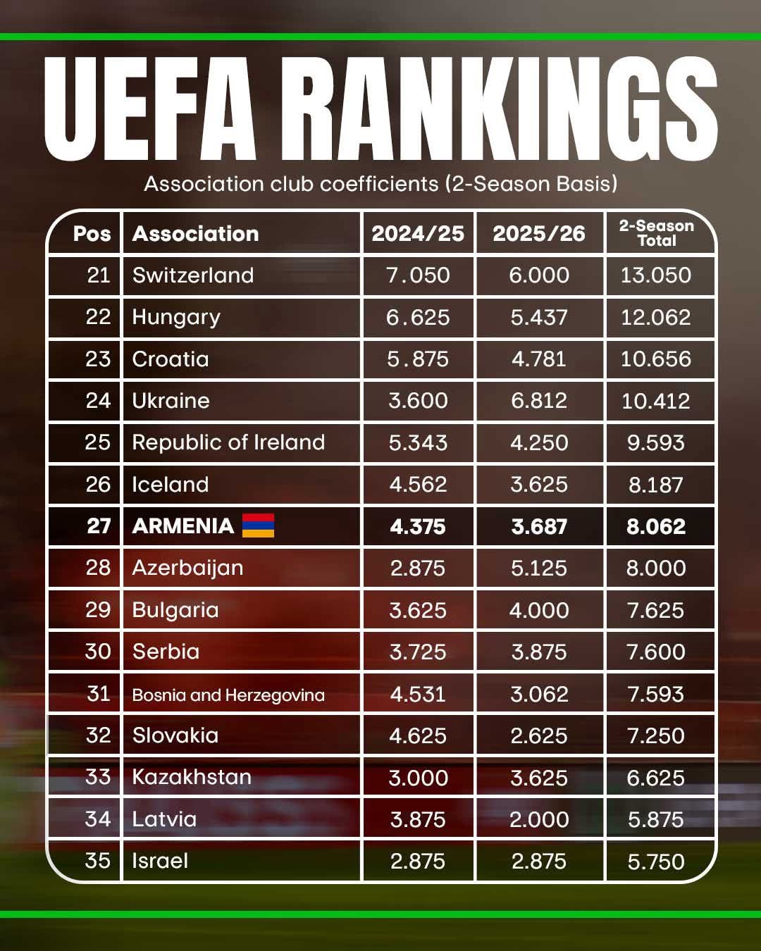 Armenia is currently in 34th place, trailing Moldova by just 0.063 points. If “Noah” can add those points to Armenia’s favor this season, then in the 2027/28 season, one Armenian team will start the competition in the Europa League instead of the Conference League.